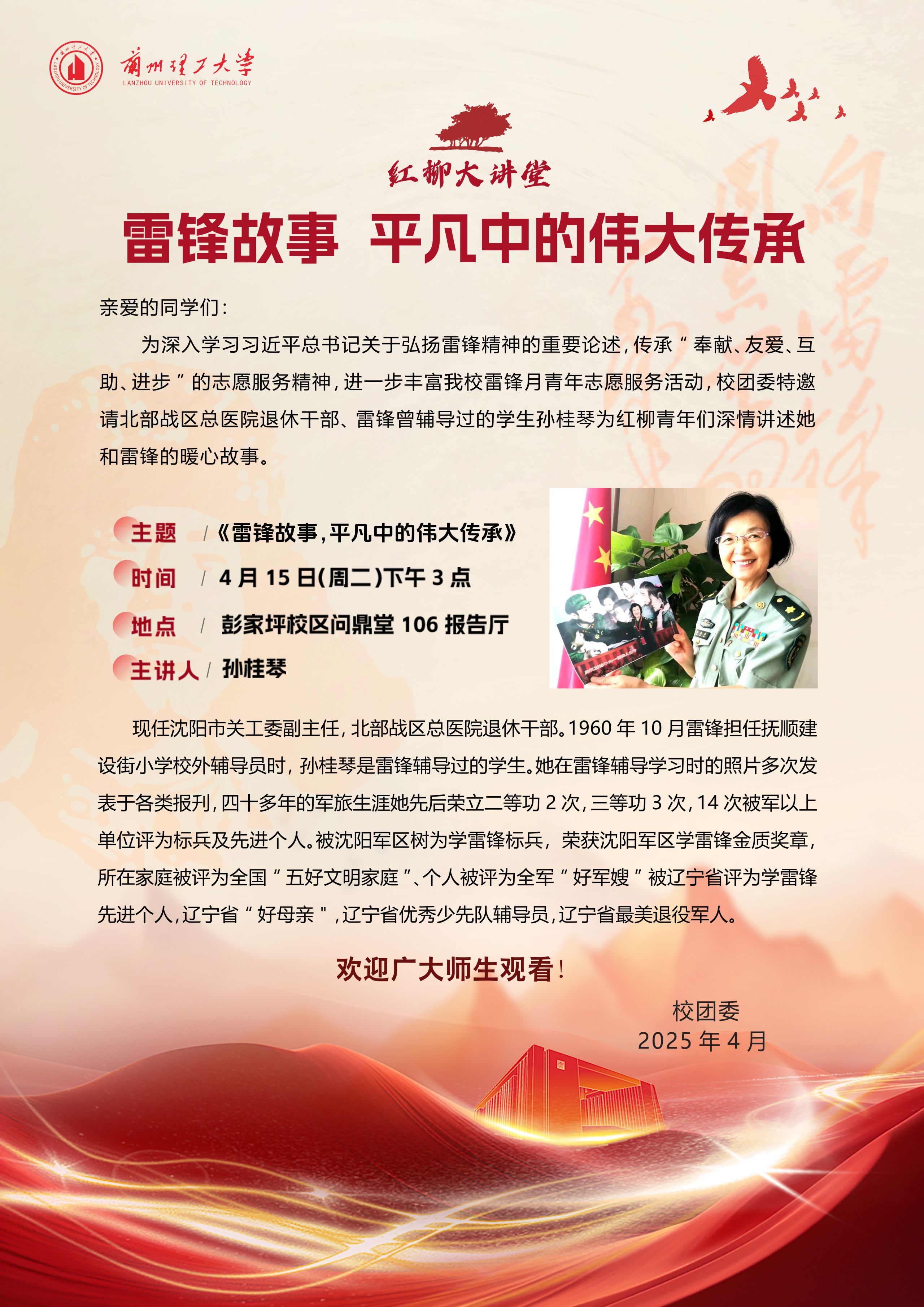 为深入学习习近平总书记关于弘扬雷锋精神的重要论述,传承“奉献、友爱、互助、进步”的志愿服务精神,进一步丰富我校雷锋月青年志愿服务活动,校团委特邀请北部战区总医院退休干部、雷锋曾辅导过的学生孙桂琴为红柳青年们深情讲述她和雷锋的暖心故事。