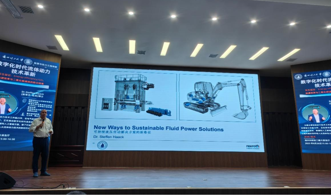 在校期间,Steffen Haack博士为我校师生作题为“能源效率与二氧化碳减排的前沿探索(Energy Efficiency/CO?)”的学术报告,从碳足迹、能效、流体介质、设计、生命周期五个关键维度,全面介绍了博世力士乐在流体传动与控制领域推动可持续发展的前沿技术方案,并通过实际产品数据与多技术路径的对比,展示了企业当前取得的核心研究进展与创新成果。